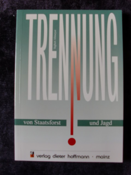 TRENNUNG VON STAATSFORST UND JAGD - von Ingbert Altmeyer, Verlag Dieter Hoffmann, Mainz 1999, 118 Seiten - Inhalt u.a.: Gesetzesgrundlagen / Kosten der staatlichen Verwaltungsjagd / Universelle Problemlösung durch Intergrierung von Waldflächen in gemeinschaftliche Jagdbezirke / Biotopbezogene Gliederung der Gesamtjagdfläche / Entlastung des angespannten Jagdpachtmarktes / Abschaffung der dienstlichen Jagdprivilegien für Forstbeamte / Einheitliche behördliche Abschussplanung / Chance für Neuorientierung in Sachen Schalenwilddichte / Entbindung der Forstbehörden von ihren jagdlichen Zuständigkeiten / Mängel und Relativierung der waldbaulichen Gutachten zum Abschussplan / Verpflichtung der Landwirtschaft / uam - Sehr guter Zustand