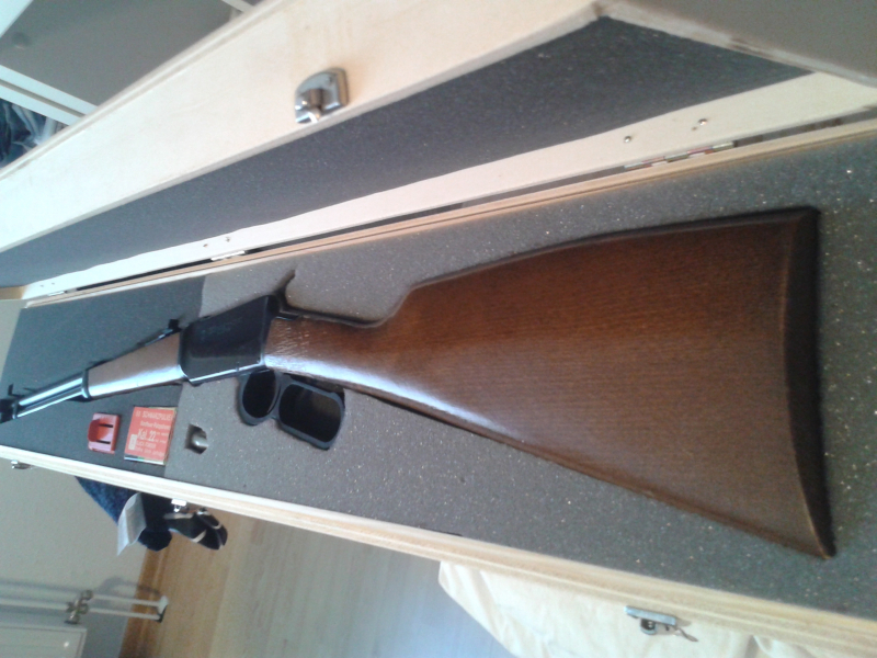 Hallo, ich verkaufe hier eine Rarität, Reck Lever Action Gewehr .22 lang Knall PTB 256 Echtholzschaft mit kleinen Gebrauchsspuren Hergestellt ca. 1981/82, mit original Abschussbecher in Edelstahl und Bedienungsanleitung als Kopien. Das Röhrenmagazin ist für 18 Schuss .22 Platzpatronen. Das Gewehr wird in einem von mir angefertigten Holzkoffer verschickt, damit das Gewehr auch heile bei dem Käufer ankommt, und es wird zusätzlich in einem Pappkarton eingepackt. Es wird die volle abgebildete Packung .22 Platzpatronen Schwarzpulver rundgefaltet und ein Speedloder in .22 für 5 Patronen mitgeliefert. Das Gewehr funktioniert am besten mit der rundgefalteten Munition. Es repetiert Butterweich und es macht Spass damit zu spielen. Der Lauf ist aus Stahl und ist komplett frei. Man kann komplett hindurchsehen. Der Lauf hat nur eine kleine Verengung ca. in der Mitte des Laufes. Der Ausschuss ist nach vorne raus, nicht so wie bei der Erma von oben aus dem Lauf. ++++++++++++++++ Dieses ist ein Privatverkauf somit keine Garantie, keine Gewährleistung und keine Rücknahme. Keine nachträgliche Minderung des Kaufpreis.++++++++++++++ Das Gewehr ist wirklich Wunderschön. +++++++++++++++++++Viel Spass damit. Frei ab 18 Jahre, bitte nach dem Kauf per eMail den Altersnachweis (kopie vom Personalausweis vorder u. rückseite zusenden).+++++Achtung!!!!!!keinen internationalen Versand, verkauf nur in Deutschland.!!!!!!!!