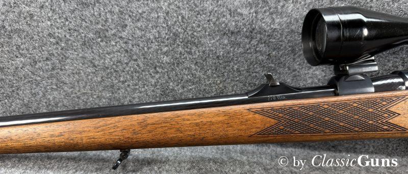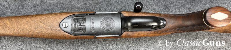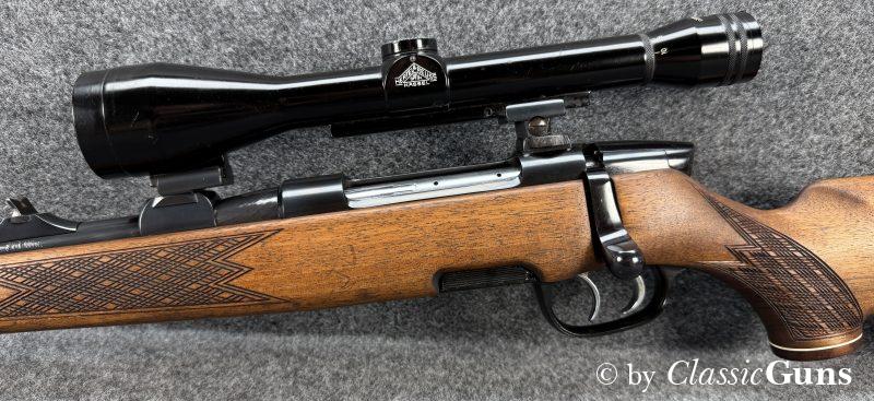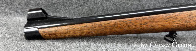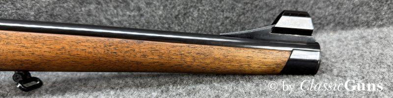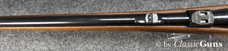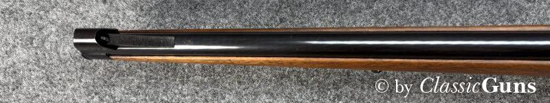 500 mm langer Lauf mit neuwertigem Zug-/ Feldprofil. Sehr schöner Vollschaft aus gutem Nussbaumholz und mit nur minimalen Gebrauchsspuren. Sehr gut erhaltene Brünierung der Stahlteile, ebenfalls mit nur minimalen Spuren des jagdlichen Gebrauchs. Der Abzugsbügel und der Magazinschacht sowie die beiden zum Lieferumfang gehörenden Magazine aus Makrolon® sind unbeschädigt. Abzug mit Deutschem Stecher.