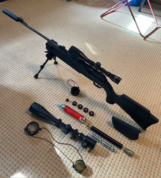 4 mal ! Trommelmagazin, Zielfernrohr 6x24, 1 mal 88g Co2 Kapsel, Adaptertank für 2x12g Co2 Kapseln, Ein Beutel Co2 12 g Kapseln ca 25 Stück., Koffer, Diabolos und Zielscheiben.