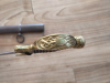 Löwenkopf-Kindersäbel aus der Kaiserzeit. Ein kurzer, nur 75 cm langer und kaum über 300 g wiegender Säbel mit stumpfer Klinge und stumpfer Spitze. Leicht gekrümmte Klinge mit Hohlekehle und gereinigten Narben (teils minimaler Flugrost), s. Fotos. Löwenkopfgefäß aus Messing mit Verzierungen. Ein Lappen zeigt eine Art Wappenschild, die Rückseote ist leer. Auf dem Fingerbügel ist unter anderem eine Trompete zu sehen. Fischhautgriff mit Drahtwicklung. Unter der Griffzwinge ist ein altes (trockenes) Stück Leder eingesetzt.