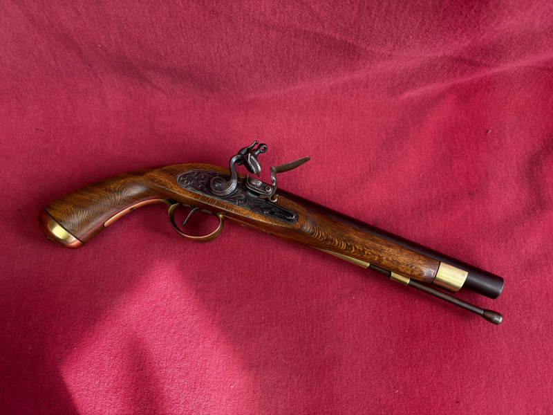 Es handelt sich hier um eine Steinschloss Pistole, unbekannter Hersteller, cal.45, gültiger Beschuss vorhanden. Butgehärtetes Schoß,