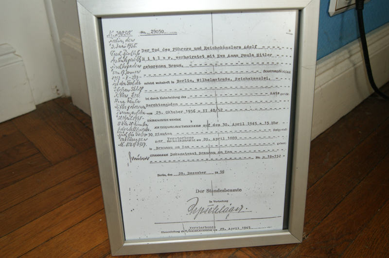 Sie bieten hier Bild mit der Abschrift der Todesurkunde von Adolf Hitler.Größe 24x30cm