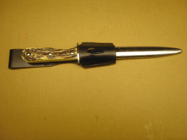 Sie bieten hier auf ein mir unbekanntes Bajonett oder einen Dolch mit Koppelschuh aus Leder, Scheide wie beim WK II Ausgehbajonett, Klinge neuwertig ohne Stempelung. Griffschalen mit drei Nieten befestigt. Gesamtlänge in der Scheide: 34 cm; Klingenlänge:20 cm. Keine Gebrauchsspuren zu erkennen. Zustand gemäß Fotos. Details und Fragen bitte vor Ablauf der Auktion klären. Farbabweichung durch Blitzlicht möglich. Privatverkauf kein Rückgaberecht und Gewährleistung. Der Bieter erklärt sich durch sein Gebot mit diesen Bedingungen einverstanden. Verkauf und Versand nur innerhalb von Deutschland mit Hermes Paket versichert.