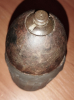 Sehr schöne preussiche 8cm c/64 Bleimantelgranate aus dem 19.Jahrhundert. Eine Seite ist top, auf der anderen Seite ist der Bleimantel durch den Aufschlag etwas verschoben (siehe Bild). Der Zündvorrichtung liegt ein zusätzlicher Nadelbolzen bei, er lässt sich nicht in die Granate einführen, da dort noch ein Teil des ursprünglichen Nadelbolzens steckt. Letzterer ist durchbohrt und die ganze Chose selbstverständlich leer. Die Mundlochschraube lässt sich widerstandslos einschrauben. Noch Fragen? Fragen! Ansonsten viel Spass beim Bieten.