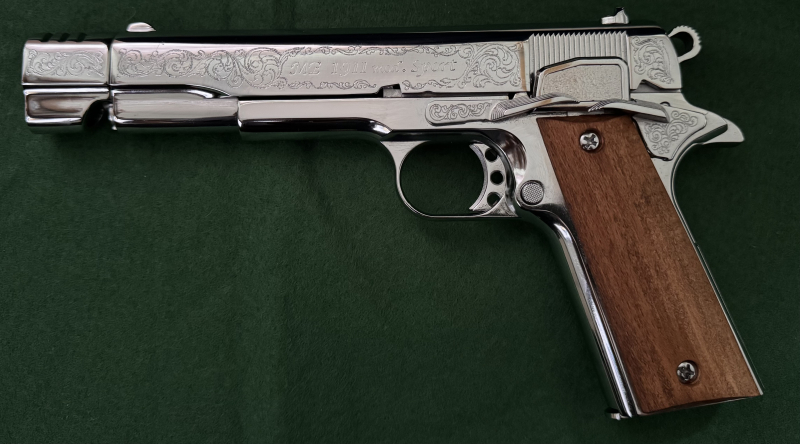 Eine Me 1911 mod. Sport cal. 9mm P.A. Knall, PTB 930 !!! Handgraviert, verchromt,