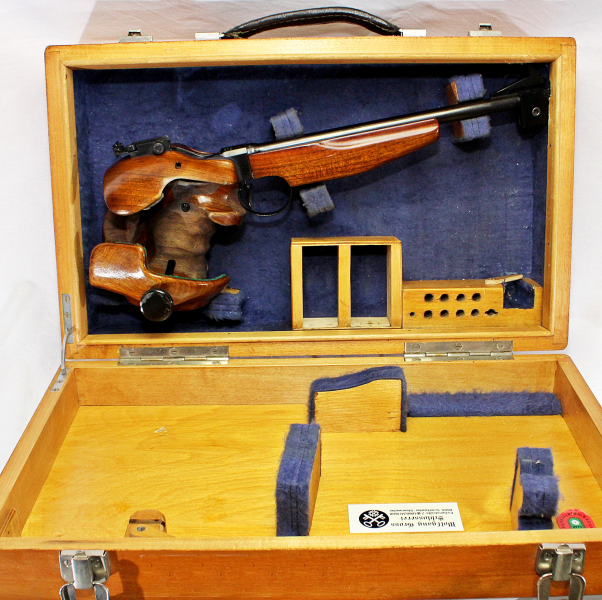 Top präzise KK-Sportpistole - Made in UDSSR. Perfekte Handlage durch hervorragend gefertigten M-Griff für mittlere Handgröße. Blockverschluss. Fein einstellbare Visierung. Ganz fein auslösender Direktabzug. Spiegelblanker, 30cm Lauf mit Laufgewicht. Gewicht 1400Gramm. Komplett mit Originalkoffer.