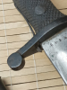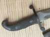 Klinge: Spanischer Stil, inspiriert von der iberischen Armee. Gerade Klinge mit breitem Schnurrbart, quadratischem Rücken innen und gebogener Schneide außen. Breiter Hohlraum bis zur Spitze.