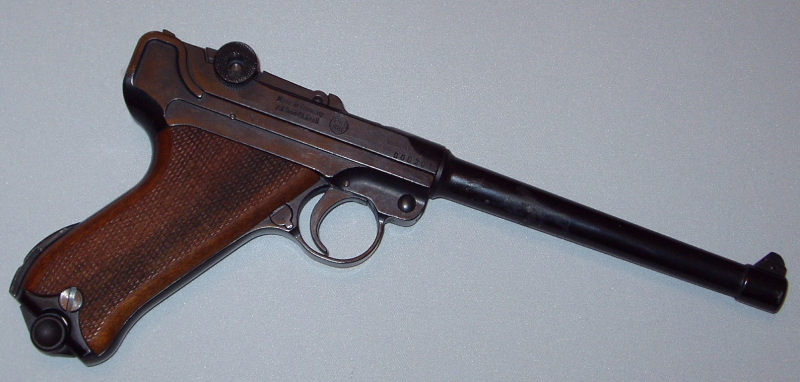 Pistole 08 Nachbau von ME mit langem Lauf, SERIENNUMMER: 000201 PTB 881. 8mm Knall. ohne Abschussbecher. Privatverkauf im Auftrag eines Freundes.