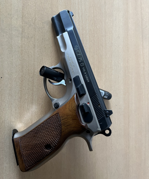 CZ 75 B, Cal. 9 x 19 in Duotone, Gehäuse mattvernickelt, verstellbare Kimme, Holzgriffschalen im Bestzustand.