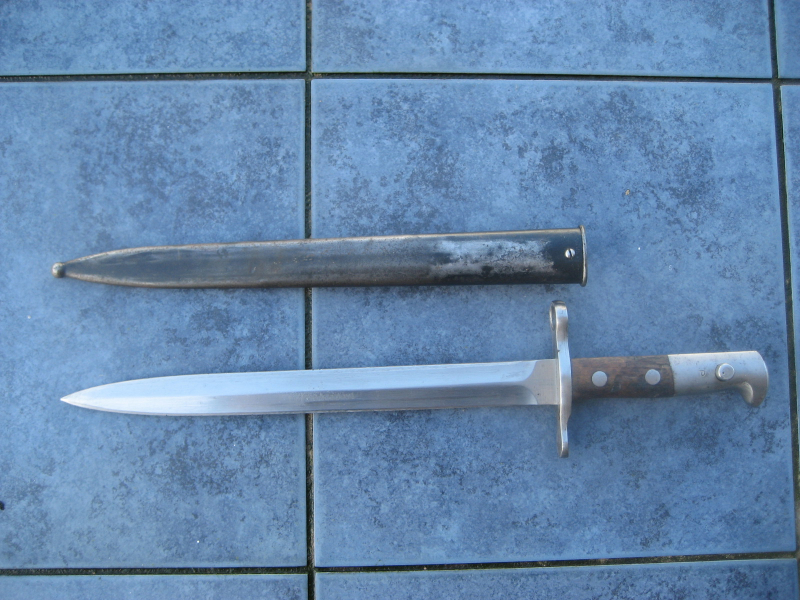 biete aus Nachlass einer alten Sammlung ein Schweizer Bajonett Schmidt-Rubin M. 1918/11/31 mit Dolchklinge der "Waffenfabrik Neuhausen". schöner Zustand, kein Rost Scheide ohne Dellen, Drücker freigängig. Als Besonderheit hat es unterhalb des Druckknopfes ein "P" gestempelt (Bild 1). Das habe ich so noch nicht gesehen. Die Bedeutung ist mir fremd (evtl. "Privatisiert"). Bestimmt weiß ein eGunner mehr.