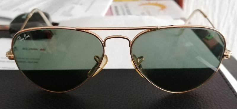 1 x Ray Ban Aviator, Metallgestell, B+L Made in USA, mit kräftig grünen Gläsern, mit neutralem Case aber ohne Ray Ban Schriftzug auf dem Glas und witzigerweise am Bügel Kunststoff mit Made in Italy gekennzeichnet.