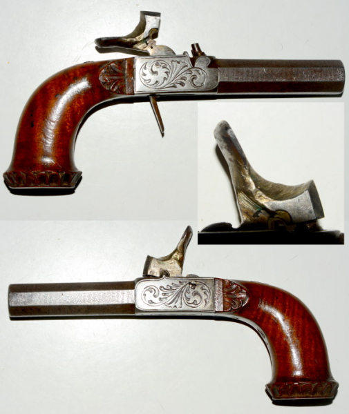 Original Perkussionsterzerol um 1860/70, Kasten mit Gravur, Lauf mit Ätzdamast, Lauflänge 64 mm, Gesamtlänge 16,6 cm, Kaliber 10,4mm, technisch völlig in Ordnung und guter Zustand, jedoch wurde der Hahnsporn vor einiger Zeit neu angesetzt, was noch besser verfeilt werden sollte. Insgesamt schöner Zustand