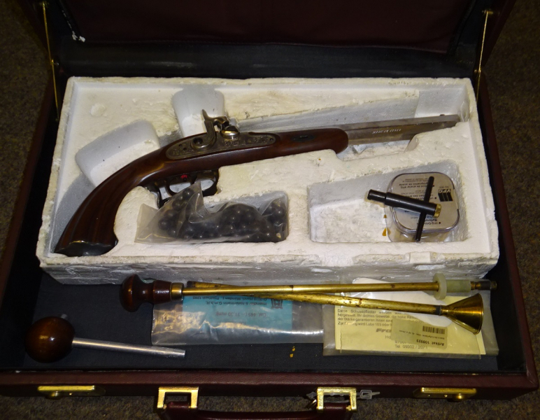 Wegen Hobbyaufgabe abzugeben: Gepflegte LE PAGE Perkussionspistole Modell "Arquebusier de l'Empereur" (Scharfschütze des Königs) Kal. .45Schwarzpulver, mit Zubehör (Ladestock, passende Rundkugeln von Haendler&Natermann, Patches, Pistonschlüssel, Reinigungsfilze) im praktischen Aktenkoffer.