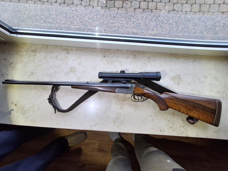 Verkaufe für mein Jagdfreud eine Merkel Bühag Doppelbüchse 9,3x74 R. Die Lauflänge beträgt 65 cm. Im vorderen Abzug ist ein Stecher. Auf der rechten Seite des Schaftes befindet sich eine Backe, somit ist es eine Linkswaffe, aber man kann auch als Rechtsschütze damit waidwerken. Der Verschluss ist stramm als wäre es eine neue Waffe. 5 Schachteln Munition Norma sind auch noch vorhanden. Es ist eine super Drückjagdwaffe. Die Schussbelastung ist sehr gering (10-15 Schuss).ES können auch Preisvorschläge gemacht werden. Für weitere Fragen stehe ich gerne zur Verfügung. 0174/7911486.
