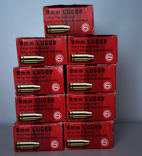 zum Erwerb stehen 9 Schachteln a 50 Schuss Geco 9x19 154grs FMJ-Flat.