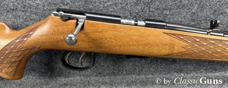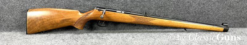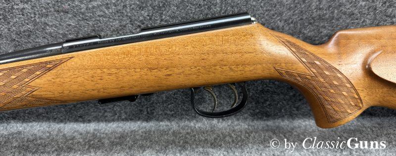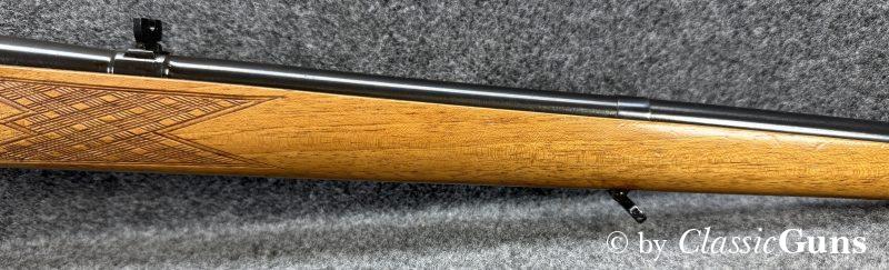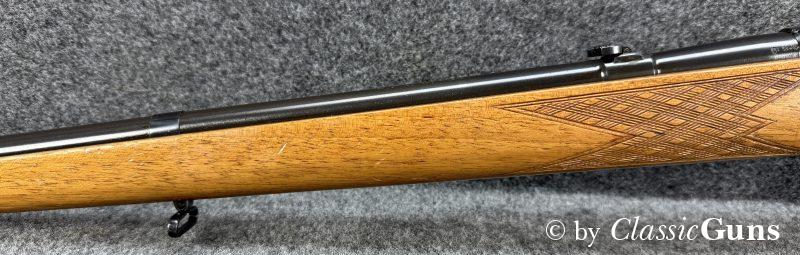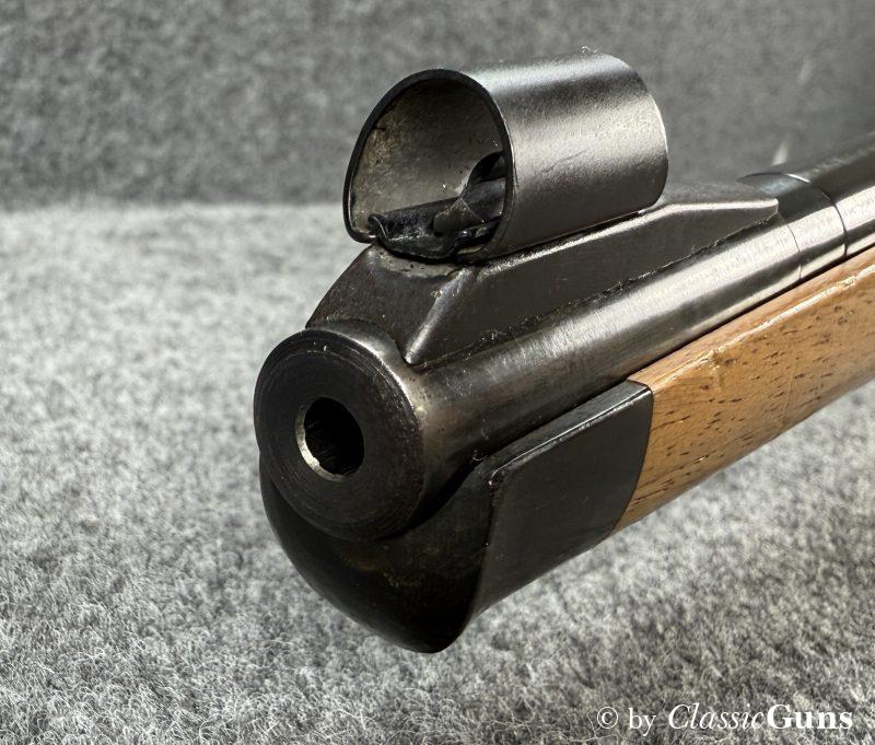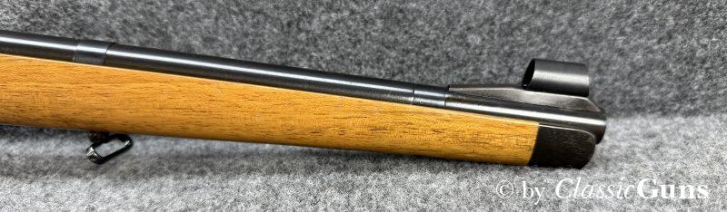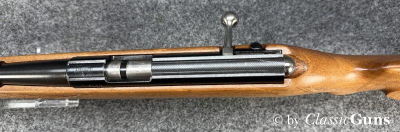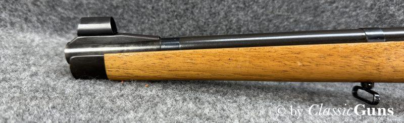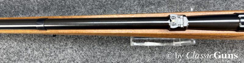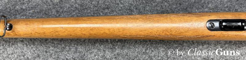 485 mm langer Lauf mit neuwertigem Zug-/ Feldprofil. Sehr gut erhaltene Brünierung der Stahlteile. Sehr schöner Nussbaum Vollschaft mit Lackfinish und nur harmlosen Handhabungsspuren. Abzug mit Deutschem Stecher, Einsteckmagazin für fünf Patronen. Gesamtlänge 960 mm, Schaftlänge 370 mm, Gewicht 2,52 kg.