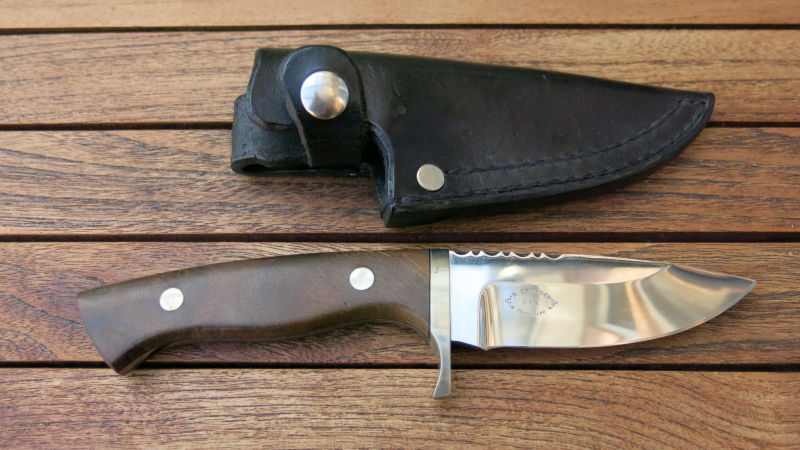 gehört ein stabile Lederscheide. Der Griff ist aus Nußbaum. Das Messer ist sehr wenig gebraucht und hat geringe Gebrauchsspuren. Dies ist ein Privatverkauf daher keine Garantie oder Rücknahme.
