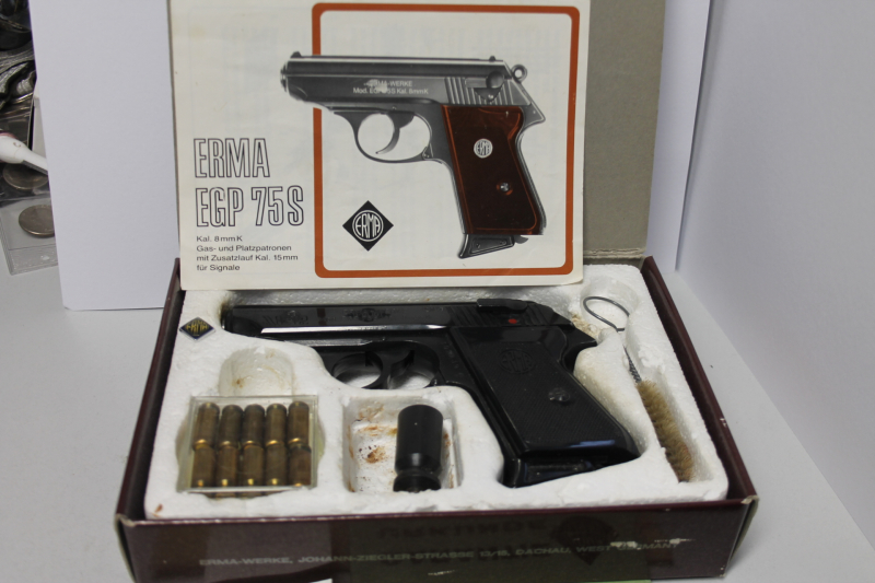 Aus meiner Sammlung biete ich an eine Erma EGP 75 S Kal. 8mmk mit Verpackung und Zubehör, die Erma Anstecknadel und die kleine Reinigungbürste auch die Garantiekarte gehören zum Lieferumfang. Die Beschreibung der Karton sowie der Signalsternbecher und 10 Schuss Munition sind Bestandteile der Auktion Die Pistole ist top gepflegt und der Zustand als neuwertig zu bezeichnen.