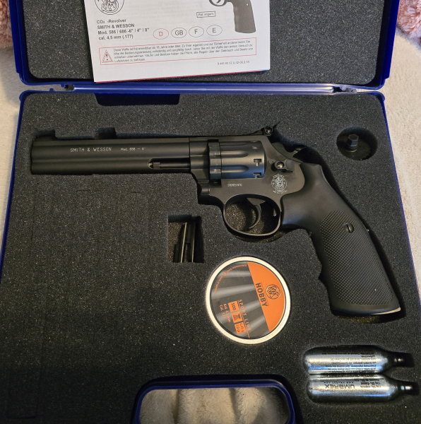 Hallo, biete hier von Smith&Wesson eine 686 in 6 zoll in 4,5mm Diabolo in schwarz. Die waffe ist im sehr guten gebrauchten zustand und würde wenig geschossen. Waffe ist aus Metall und hat kein blowback. Mit dabei ein Waffenkoffer, anleitung, Diabolos, 2 co2 kartuschen und ein ladering. Versand: 6€ bis zu 3 waffen Shipping Europe: 15€ Altersnachweis erforderlich.