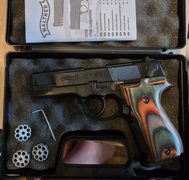 Hallo, biete hier von Walther eine CP88 in 4,5mm Diabolo in schwarz mit Echtholzgriffen. Die waffe ist im sehr guten gebrauchten zustand und würde wenig geschossen. Waffe ist aus Metall und hat kein blowback. Mit dabei ein Waffenkoffer, anleitung und ein sechskantschlüssel und 3 laderinge.