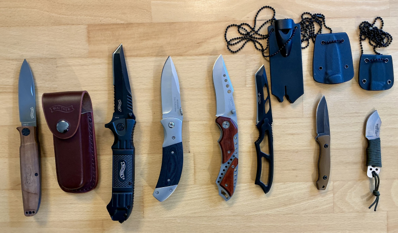 Von links nach rechts: Walther Klappmesser mit Scheide, Walther Black Tac Tanto, Herbertz Top Collection Einhandmesser, Herbertz Einhandmesser, Haller Tanto Neck Knife, Neck Knife unbekannt, Wald & Forst Mini Neck Knife.