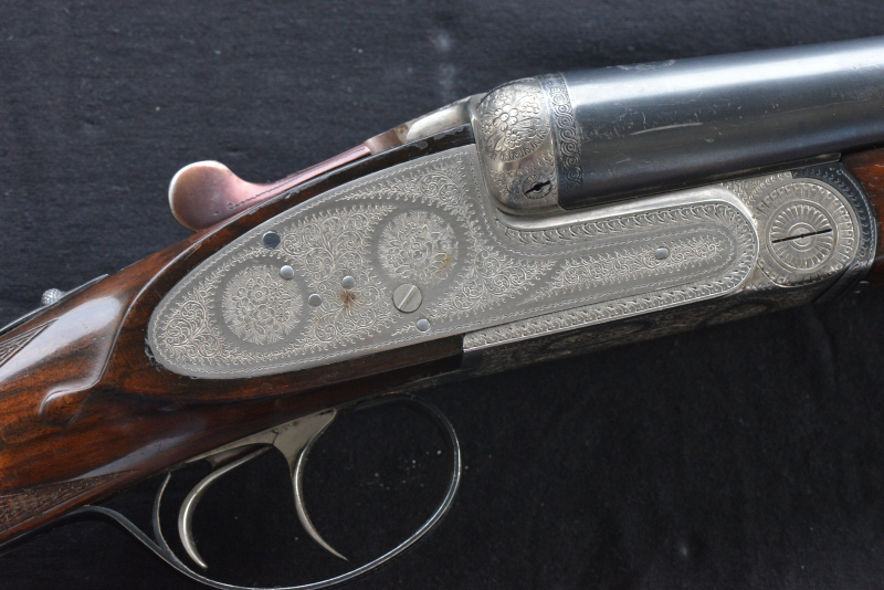 Quer-Doppelfinte Zamacola Hermanos Eibar Marke 12/70 herausnehmbare Seitenschlosse, engl. Schaft nicht geschränkt, Doppelabzug mit Rücksprunggelenk , Ejektor, schmale Laufschiene, englischer Schaft, feine Rosenbuquet-Gravur, mittlere Gebrauchsspuren Choke li. = **, re. = **** Lauflänge: 70cm Schaftlänge: 36 cm Gesamtlänge: 113cm, Schaftabschluß Holz, Nr. 64332, Gewicht: 3,15 kg,