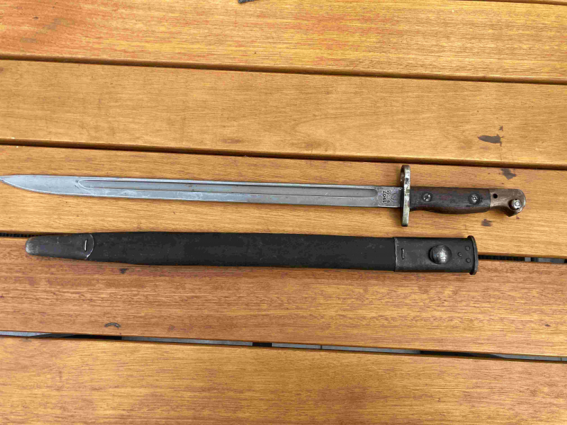 Enfield-Bajonett Mod. 1907 für das British Lee-Enfield-Rifle No. 1 MK III aus extrem seltener US Remington-Fertigung. Das Bajonett wurde nie gesäubert, poliert, geschärft oder sonstwie nachgearbeitet. Es befindet sich in absolutem Originalzustand. Auf der Fehlschärfe die Modellbezeichnung 1907, die Herstellermarke "Remington" in einem Kreis, sowie die Ziffern 9 und 15, wohl das Herstellungsdatum. Auf der anderen Seite diverse Abnahmestempel des britischen Empires, so z. B. für den bestandenen Biegetest. Der Drücker funktioniert einwandfrei.