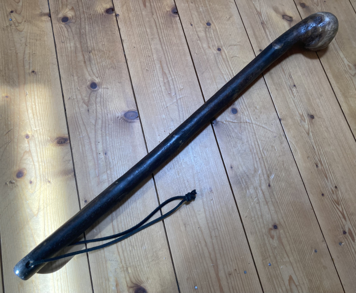 Ich biete hier einen handgefertigten irischen Shillelagh, der berühmte Kampfstock aus Irland. Diese Stöcke aus Blackthorn (Schwarzdorn, Schlehe) wurden in Irland zur Selbstverteidigung und in den berühmt-berüchtigten Faction-Fights benutzt. Handgefertigt in Irland von der Traditions-Stockmacherei McCaffrey Crafts. Hierbei handelt wa sich um einen sogenannten Cudgel, ein kurzer Kampfstock mit robustem Knauf und Handschlaufe aus Rindsleder. Ca. 70 cm lang, ca. 330 g schwer. Dazu ein passender Trainingsstock. Ein wunderschönes Einzelstück, wie man es nur selten bekommt. NP 100 Euro. Da dies ein privater Verkauf ist, gewähre ich keine Garantie und kein Rückgaberecht (siehe EU-Recht).