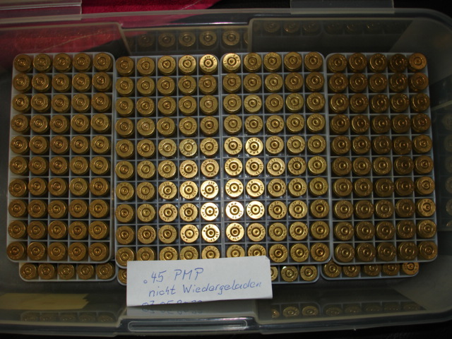 ich verkaufe hier 400 Stück Hülsen .45 ACP (PMP), einmal abgeschossen, nicht wiedergeladen, im Tumbler gereinigt, mit Boxer Zündung. Privatverkauf, keine Garantie, keine Rücknahme, Versandkosten trägt der Käufer. egun übernehme ich. Kein Paypal.