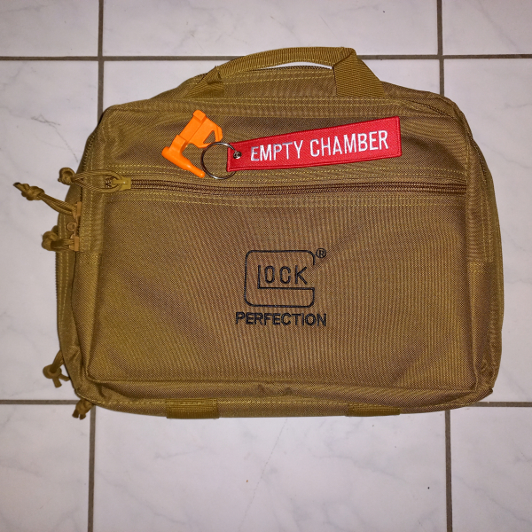 Hier zum Verkauf eine Pistolentsche von Glock mit zwei abgetrennten Bereichen für 2 Sportgeräte, sowie Magazinfach für 5 Magazine. Beide Fächer abschließend über Schloß am Reißverschluss. Dokumentenfach vornedran. Die Tasche ist unbenutzt und ein Souvenir von der IWA. Qualität ist sehr gut, robust. Typisch Glock halt. Passt super für die 19x wegen der Farbe. Dazu gibt's eine Safety Flag mit Kammereinsatz in Rot-orange, um den Sicherheitszustand anzeigen zu können geschenkt dazu. Hab noch eine in schwarz.
