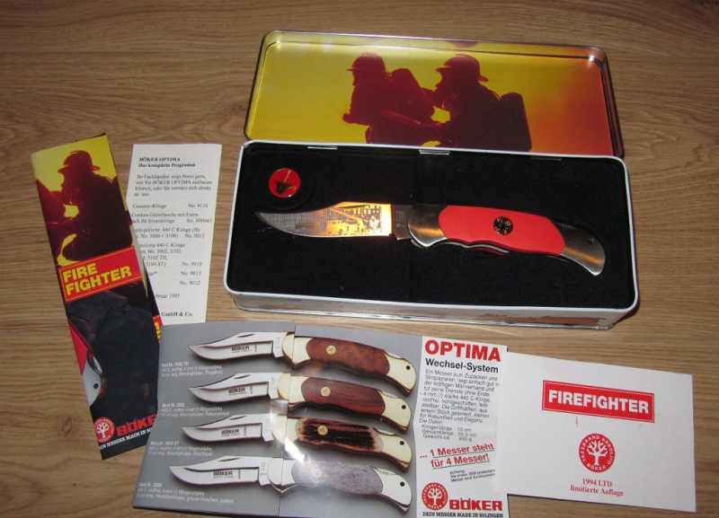 Original BÖKER (Tree Brand) Sammlermesser "Firefighter", aufgelegt im Jahr 1994 zu Ehren aller Feuerwehrmänner, die ihr eigenes Leben der Gefahr aussetzen, um andere zu retten. Handmade in Solingen; feststellbares Taschenmesser/Fahrtenmesser mit vorn geschwungener Klingenform. Arretierende Klinge mit 8cm Klingenlänge. Links in der Klinge ist ein Geräte- und ein Leiterwagen eingeätzt. Für die Sammlung gekauft und nie benutzt. Ab Werk bereits schön scharf geschliffen. Die Klinge blieb all die Jahre unberührt. Als Geschenk geeignet.