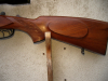 Nussbaumschaft mit Pistolengriff und Schweinsrücken sowie deutscher Backe. Vorderschaft und Pistolengriff mit schottischer Fischhaut, Schaftabschluss Blaser-Schaftkappe