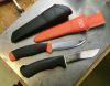 Two Fixed Blade Swedish Knives for one Price! One knife from Mora with black grip and green accent and black, plastic sheath. Bahco knife with black grip and orange accent and orange, plastic sheath. Both blades are stainless steel, machine polished with typical Scandi grinds. Both Made in Sweden! Condition: Mint, as new, never used or sharpened.
