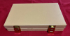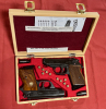 Die Kassette ist mit feinem Leder bezogen und innen mit rotem Filz ausgelegt, für die Aufnahme der beiden Pistolen, 10 Patronen, den beiden Abschussbechern und den dazugehörigen Bedienungsanleitungen.