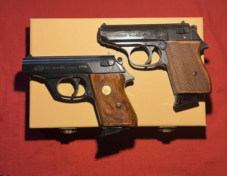 Walther PPK mit PTB-Nr.: 502 mit Holzgriffschalen. Mauser HSc mit PTB-Nr.: 335/2 mit original Mauser-Griffschalen.