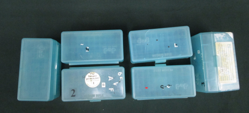 6 Patronenboxen J&J Medium Rifle, mit Gebrauchsspuren/Aufklebern, aber voll in Ordnung, Innenhöhe ca. 7,5cm