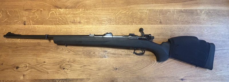 98er im Kaliber 8x57is, mit Hogue Schaft in schwarz und einem Recknagel Abzug.