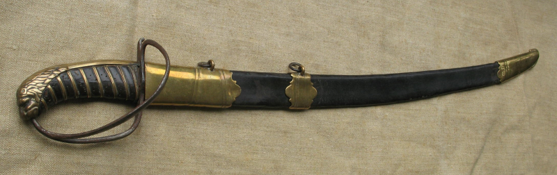 Alter Säbel (Marine?) mit Löwenkopf , das Gefäß mit Haupt und Nebenbügel in ungewöhnlicher Eisen Ausführung. Lederscheide mit Messingbeschlägen, Rücknaht geschlossen. Klinge fleckig und leicht genarbt, siehe Fotos. Gesamtlänge ohne Scheide ca. 80 cm, Klingenlänge ca. 67 cm, Klingenbreite ca. 33 mm.