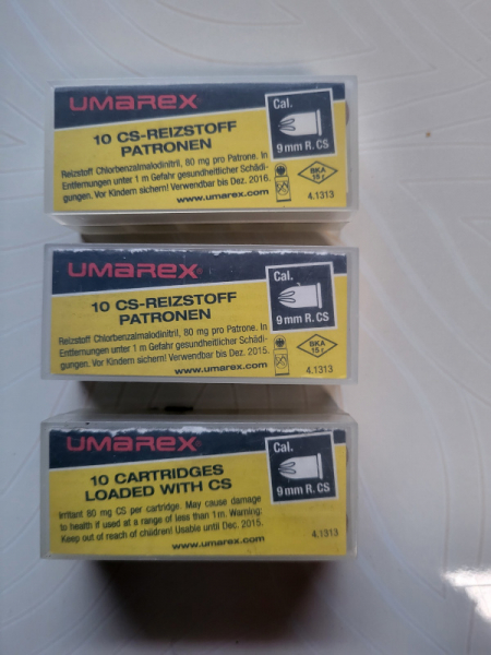 Sie kaufen 1 Packung (10 Stück) alte Umarex Gaspatronen Cal. 9mm Revolver, abgel. 12/2015. Patronen orig. Verpackt.