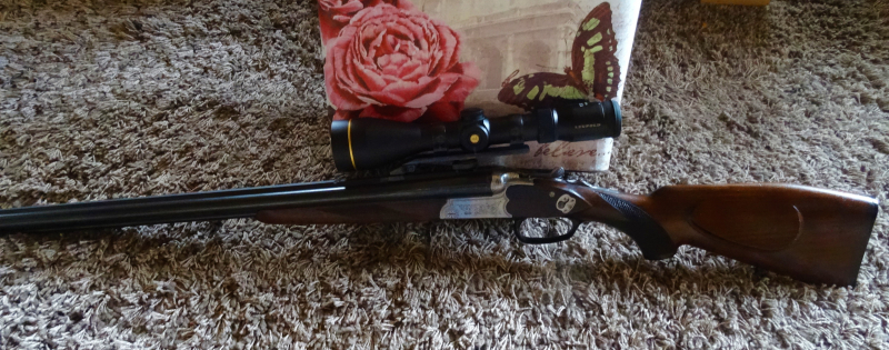 Schrotlauf links Vollshock. Die Brünierung ist sehr gut erhalten. Nußbaumschaft mit Deutscher Backe.Ges Gewicht mit der Optik nur 3600g