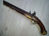 Die Pistole stammt aus einem Nachlass und befindet sich in einem sehr guten Zustand. (siehe Bilder) Nußbaum/Messing/Eisen. Vollschäftung. Runder Lauf und Schloßplatte mit Steinschloßvorrichtung aus Eisen. Abzugbügel und der schwere Kolben aus Messing. Punzierungen auf dem Schloßblech, u.a. Tower`links vom Hahn. Weitere Bilder gerne auf Anfrage. Besichtigung und pers. Abholung ist nach Absprache möglich. Verkauf nach EU-Recht ohne Garantie, Umtausch oder Nachverhandlungen