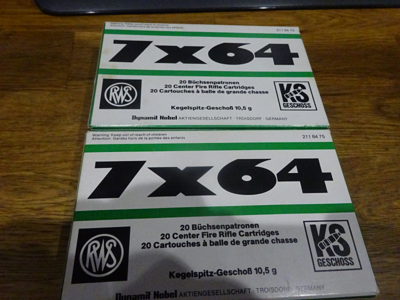 aus Jägernachlass: Konvolut Patronen Kal. 7x64 von RWS - 31 Patronen mit 10,5 KS Geschoss- eine versiegelte Packung voll, eine angebrochen mit 11 Schuss, dritte Packung mit 9 Patronen 11,5 gr TIG Geschoss, siehe Foto und mein egun