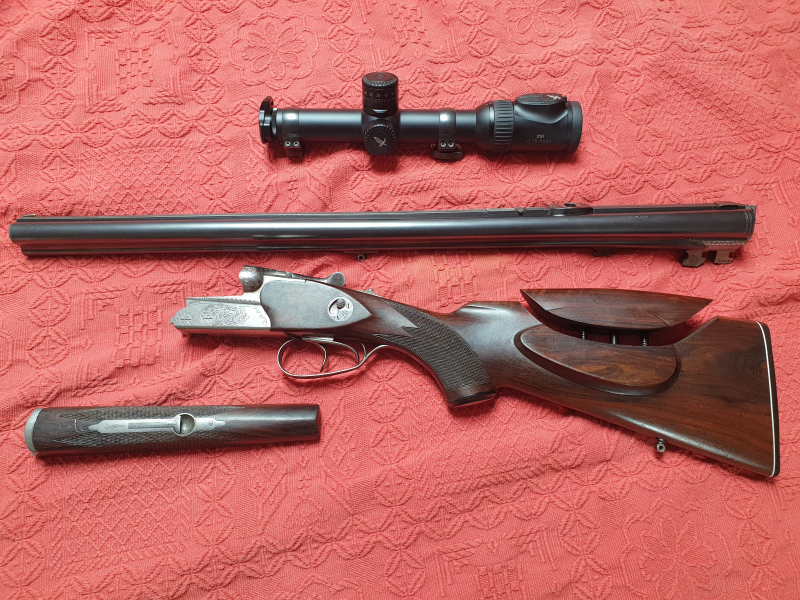 Durch die Einlage in den linken Schrotlauf, können beide Kugeln ohne Umschalten, hintereinander geschossen werden - Büchsflintendrillingcharakter!