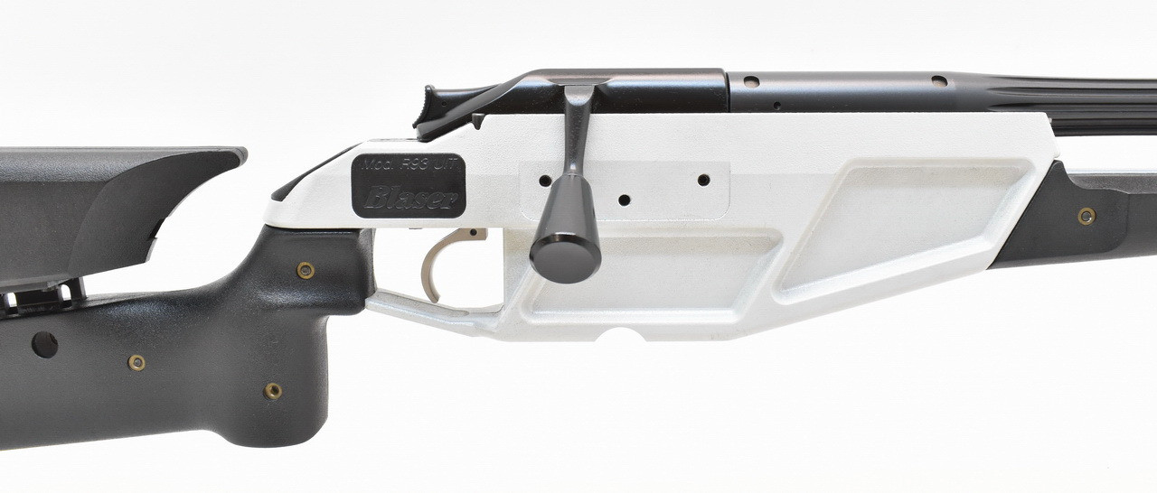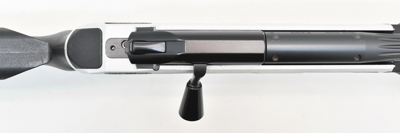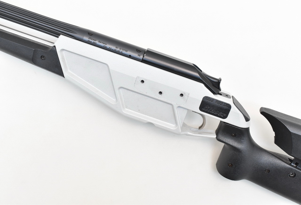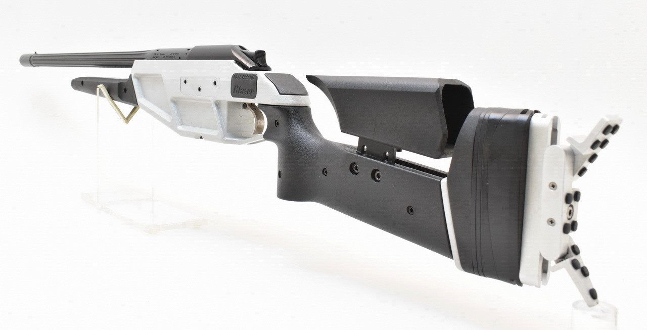 Einschüssiges, 300m - Standardgewehr mit Geradezugverschluß und Handspannung auf bewährter R 93 Basis des bekannten deutschen Herstellers BLASER . Spiegelblanker, kannelierter Präzisionslauf mit 26mm Mündungsdurchmesser. Ulmer Beschuß 1997. Einstellbarer Blaser Kompaktabzug. RAL 9006 farbiger Aluminium - Schaft in Skeleton - Bauweise mit schwarzen Kunststoff Anbauteilen für Rechts- und Linksanschlag. Verstellbare Backe und MEC Contact Alu - Schaftkappe. Gebrauchs- und Lagerungsspuren sind vorhanden. Details siehe Bilder.