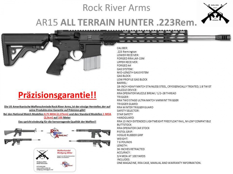 Biete ein AR15 im Kaliber .223Rem. Modell ATH All Terrain Hunter des US amerikanischen TOP Herstellers Rock River Arms! Sie werden mit dieser Waffe jeden anderen Selbstlader in Punkto Präzision und Verarbeitung schlagen! Kein Oberland, Schmeisser, Windham, Hera!!! Die Waffe verfügt über einen 18" Heavy Match Stainless Steel, Cryogenically Treated, 1:8 Twist, Lauf freischwingend, RRA Two Stage Ultra Match Varmint Abzug und 10 Schuss Magazin! Die Waffe wird im Rock River Koffer geliefert! Bitte vor dem Kauf Kontakt zu mir aufnehmen! Ein kostenloses Einlagern bis zur EWB ist kein Problem! Rock River Arms gehört zu den besten Waffenherstellen Weltweit und ist in den USA die Nummer 1 Sie werden keine bessere Waffen bekommen! Auch andere Modelle in verschiedenen Kalibern des Herstellers lieferbar! Lieferzeit und Preis bitte anfragen!!!!!! WWW.Waffen-Miller.de Rock River Arms ist einer der Weltweit besten Waffenhersteller, sollten Sie mit der Waffe nicht zufrieden sein, nehme ich sie wieder zurück(qualitativ oder Schussleistung) !Rock River Arms ist der einzige Hersteller der eine Präzisionsgarantie von einem 3/4 MOA auf 100m gibt. www.waffen-miller.de Wir führen auch Waffenexporte ins Europäische Ausland durch, fragen Sie an !! CALIBER:.223 Rem. LOWER RECEIVER:Forged RRA LAR-15M UPPER RECEIVER:Forged A4 GAS SYSTEM:Mid-Length Gas System GAS BLOCK:Low Profile Gas Block BARREL:18" Heavy Match Stainless Steel, Cryogenically Treated, 1:8 Twist MUZZLE DEVICE:RRA Operator Muzzle Break / 1/2–28 Thread TRIGGER:RRA Two Stage Ultra Match Varmint Trigger TRIGGER GUARD:RRA Winter Trigger Guard SAFETY SELECTOR:Star Safety HANDGUARD:RRA 13 Inch Extended Lightweight Free Float Rail, M-LOK® Compatible BUTTSTOCK:RRA Operator CAR Stock PISTOL GRIP:Hogue Rubber Grip WEIGHT:7.6 pounds LENGTH:36 Inches Retracted ACCURACY:3/4 MOA at 100 Yards INCLUDES:One Magazine, RRA Case, Manual and Warranty Information. ACCURACY:3/4 MOA at 100 Yards INCLUDES:One 10 Round Magazine, RRA Case, Manual and Warranty Information Die Firma Rock River Arms, Mit Garantie, das Beste vom Besten!!! Rock River Arms ist im Besitz der Brüder Mark und Chuck Larson und wird von ihnen betrieben. Zwischen 1981 und 1991 arbeiteten die Larsons bei Springfield Armory, Inc., wo Mark der leitende Waffenmeister war. Von Springfield Armory aus gründeten die Larsons eine Partnerschaft mit Les Baer, um Les Baer Custom zu gründen und maßgefertigte Pistolen des Kalibers 1911 herzustellen. Nach der Trennung von Les Baer im Jahr 1993 begannen die Larsons mit der Herstellung von Gewehren des Typs AR-15 für Eagle Arms in Coal Valley, Illinois. Etwa zur gleichen Zeit gründeten sie ihr eigenes Unternehmen Tolerance Plus (der Name wurde später in Rock River Arms geändert), das maßgefertigte Pistolen des Kalibers 1911 herstellte. Die Larson-Brüder trennten sich 1997 von Eagle Arms, als das Unternehmen nach Geneseo, Illinois, umzog. Zur gleichen Zeit begann Rock River Arms mit der Herstellung von Gewehren des Typs AR-15. Rock River Arms produziert auch Pistolen des Modells M1911, Repetiergewehre und Pistolen im AR-15-Stil in verschiedenen Kalibern.