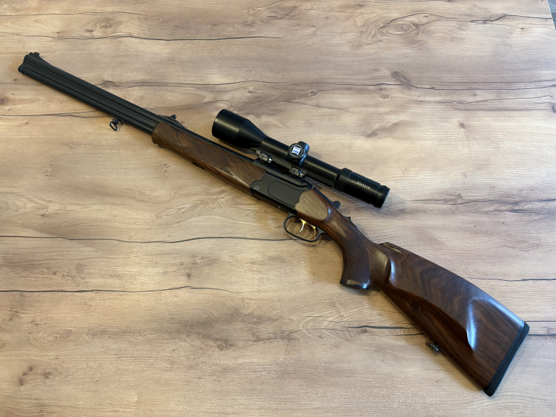 System Bockbüchsflinte mit robustem Jäger-Kippblock-Verschluss. Die Waffe verriegelt Stahl auf Stahl. Das Einschloss-System verfügt über eine separate Handspannung.