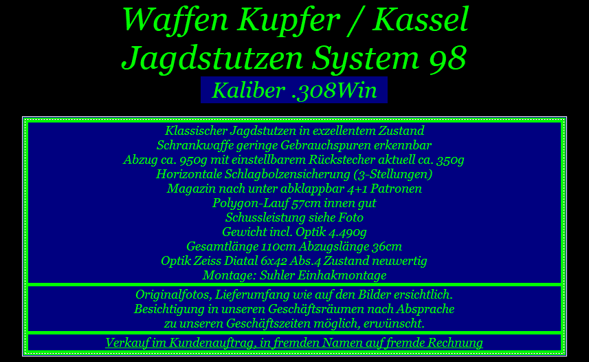 Informationen im Rahmen der neuen Produktsicherheitsverordnung: Hersteller: Waffen Kupfer Kassel EU-Verantwortlicher: Waffen-Lachenmaier GbR, Entengasse 5, 76275 Ettlingen Mail: info@waffen-24h.de