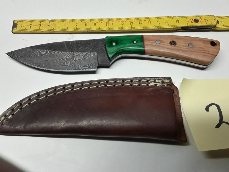 Stabiles feststehendes Sehr schönes Damastmesser, Klingenstsärke 3,6mm, Hand genähte stabile Lederscheide mit Gürtelschlaufe.
