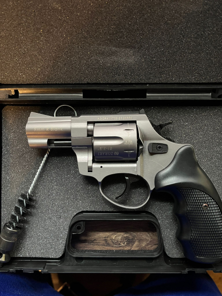 Zoraki R1 titan edition mit 6 Schuss Trommel, Spitzenverarbeitung und wie bei Zoraki gewohnt, absolute Zuverlässigkeit zu einem äußerst fairen Preis. Mit seinen 725g und den ergonomisch geformten Griffschalen aus Polymer liegt der Revolver satt in der Hand. Es wurde lediglich 50 Schüsse abgegeben. Technische Daten des Zoraki R1 Schreckschussrevolver: Hersteller: Zoraki Modell: R1 Typ: Schreckschussrevolver System: Gas- Signal Farbe: Titan / Schwarz Trommelkapazität: 6 Schuss Lauflänge: 2,5 Zoll Gesamtlänge: ca. 186 mm Höhe: 140 mm Breite: 36 mm Gewicht: 750 g Abzug: Single- und Double-Action Visierung: Kimme und Korn Sicherung: Manuell Material: Metall/ Kunststoff Griffschalen: Kunststoff Lieferumfang: 1x Zoraki R1 Titan Schreckschussrevolver Kal. 9mm 1x Anleitung 1x Kunststoff-Koffer Frei verkäuflich an Personen über 18 Jahren.